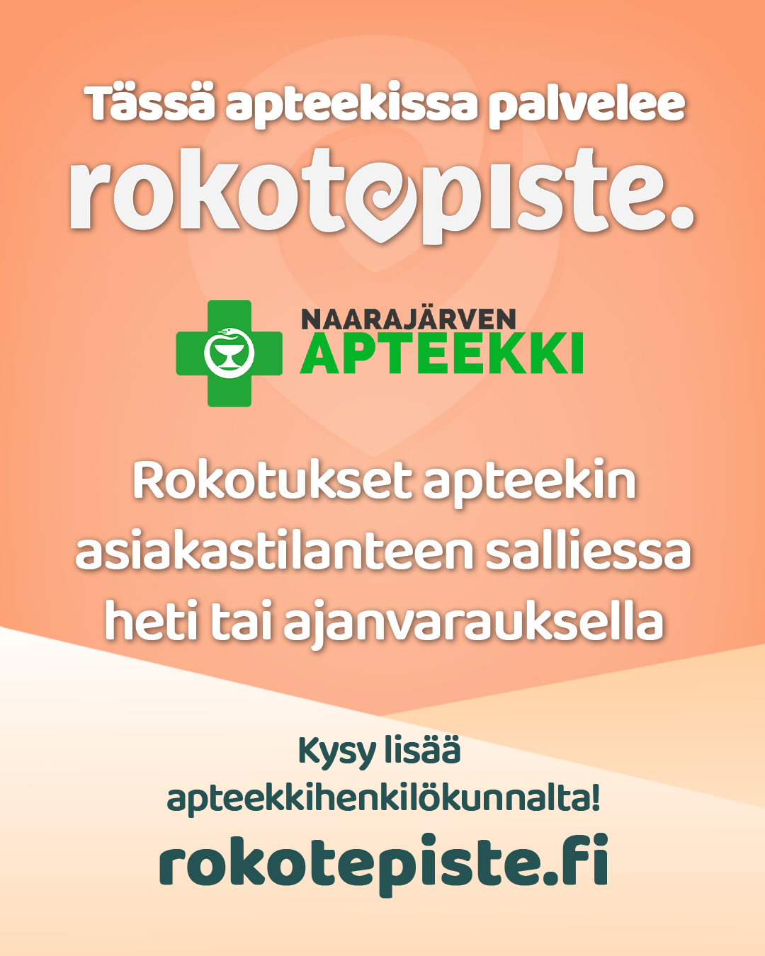 Rokotukset sekä Naarajärven että Jäppilän apteekeista ilman reseptiä. Voit varata ajan suoraan apteekista tai Suomen Rokotepisteen sivuilta. Rokotamme asiakastilanteen salliessa myös ilman ajanvarausta.
